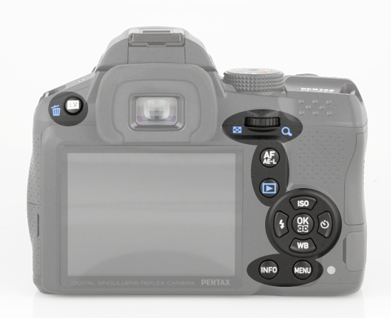 Układ przycisków tylnej ścianki nieco się zmienił w stosunko do modelu K-r. Obok prawego górnego rogu wyświetlacza znajduje się tylne pokrętło sterujące. Pod nim umieszczono dwa przyciski: blokadę AF/AE-L oraz wejście do trybu przeglądania zdjęć. Wybierak wielofunkcyjny stanowią cztery klawisze służące do przemieszczania się po menu aparatu, a także zatwierdzający guzik OK pośrodku. Oprócz roli nawigacyjnej, przyciski te pełnią również inne funkcje, wymienione poniżej: