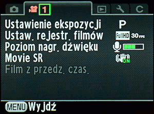 Dodatkowo, mamy trzy ustawienia jakości nagrywanych filmów: dobra (*), lepsza (**), najlepsza (***). Filmowanie może odbywać w trybach: P, Av oraz M. W trybie manualnym możemy dostosować czułość, czas naświetlania oraz przysłonę, ale tylko przed uruchomieniem rejestracji. Po jej rozpoczęciu, można jedynie korzystać z kompensacji ekspozycji (w zakresie ±2 EV). Regulacji czułości mikrofonu dokonujemy w menu, podobnie jak włączenia stabilizacji. Profile kolorystyczne („zdjęcie niestandardowe”) oraz filtry cyfrowe mogą być także użyte przy rejestracji filmu. Lista filtrów jest ograniczona o jedną pozycję w stosunku do trybu fotografowania i przedstawia się następująco: