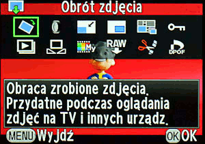 Podczas przeglądania zdjęć, przy pomocy przycisku WB możemy uruchomić menu edycji zdjęć. Opcje tam zgromadzone są następujące:
