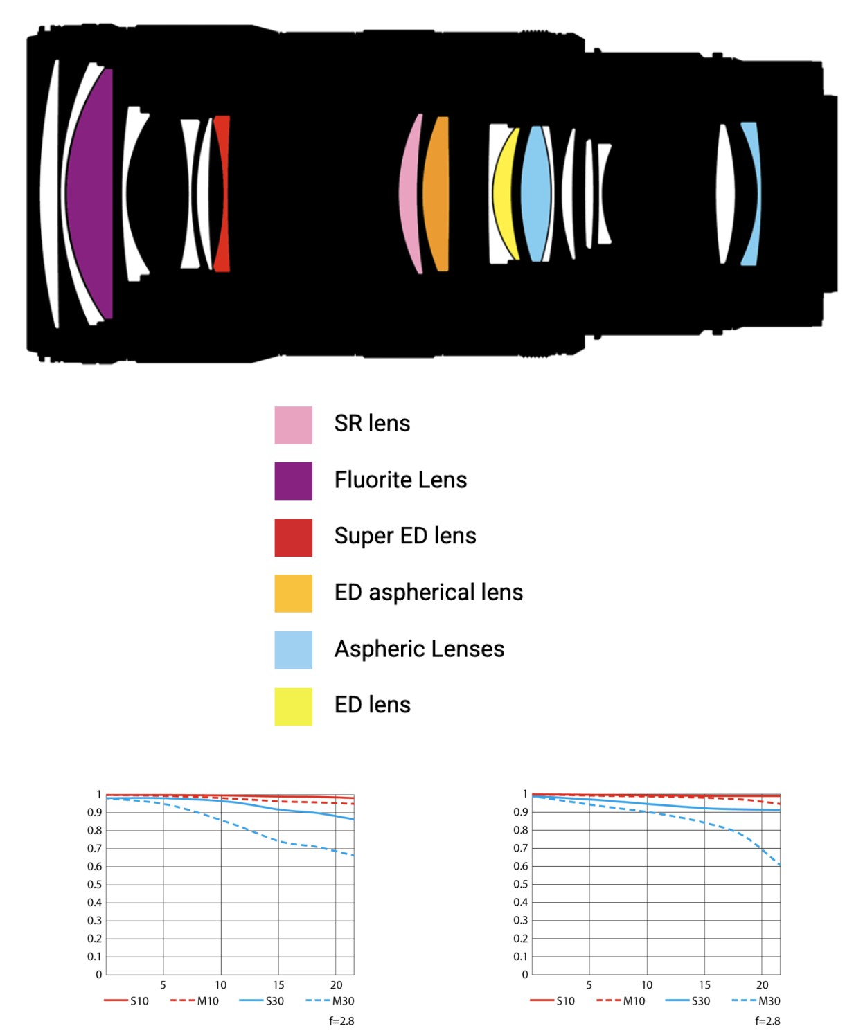 - Konstrukcja: 18 elementów / 16 grup (1 soczewka ze szkła ED, 1 ze szkła Super ED, 2 soczewki asferyczne, 1 asferyczna ze szkła ED, 1 soczewka fluorytowa i 1 soczewka SR),
