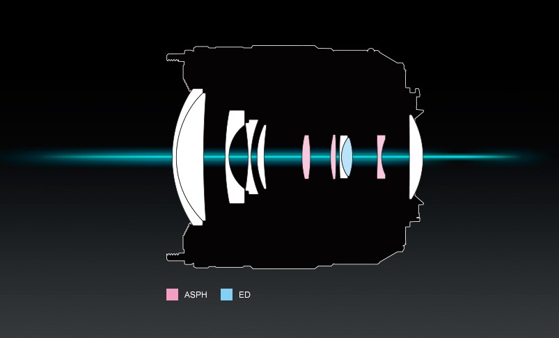 Jeśli chodzi o konstrukcję optyczną, mamy do czynienia z 11 soczewkami ustawionymi w 9 grupach. Trzem elementom nadano kształt asferyczny, natomiast jeden wykonano ze szkła niskodyspersyjnego ED. Wewnątrz możemy jeszcze znaleźć przysłonę o siedmiu listkach, którą możemy domknąć maksymalnie do wartości f/22.