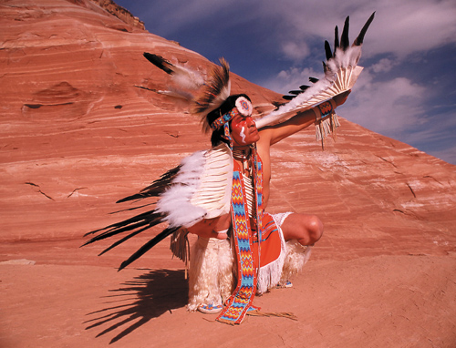 Jak zapewne się zorientujesz, w tej lekcji umieściłem więcej zdjęć niż w którejkolwiek innej. Stało się tak z bardzo konkretnego powodu: dostrzeganie światła stanowi jeden z kluczowych elementów tworzenia udanego zdjęcia. Jeśli nauczysz się widzieć światło — jasne i ciemne elementy fotografowanej sceny, jej kontrast i kolor, kierunek padania światła czy jasność głównego motywu i jego tła, a nawet ruch światła — będziesz w stanie podjąć trafne decyzje dotyczące naświetlania i staniesz się lepszym fotografem. Będziesz również wiedział, kiedy musisz kontrolować światło za pomocą płaszczyzny odbijającej, rozpraszającej albo lampy błyskowej. Czasami też zauważysz, że światło w danym miejscu zwyczajnie nie jest odpowiednie i trzeba przenieść fotografowany obiekt lub zmienić kompozycję zdjęcia, tak jak zrobiłem to ja w przypadku tego zdjęcia rdzennego Amerykanina w stroju ceremonialnym niedaleko Lake Powell w Arizonie.