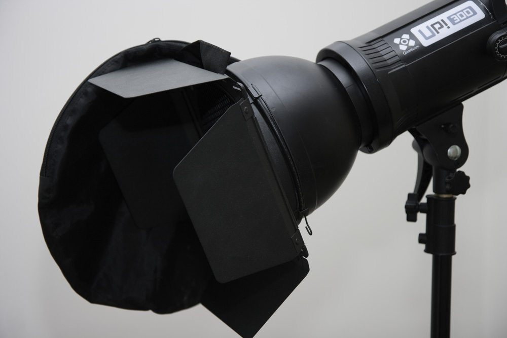 Wynikowe zdjęcie wskazuje na jeden zauważalny problem – mocowanie wrót i czasza zawierają pewne luki, przez które „przecieka” światło. W efekcie tło rozświetla niepożądana smuga światła. Problem ten rozwiązaliśmy w bardzo prosty i tani sposób – osłaniając wrota dodatkowo czarnym materiałem do przechowywania blendy.