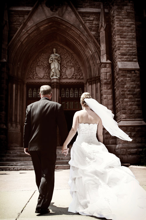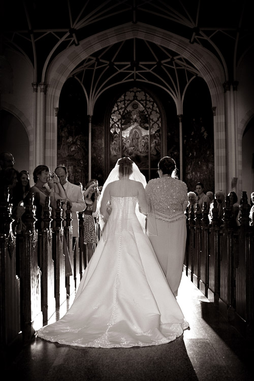 Nie uzyskasz tego rodzaju ujęć, jeśli jednocześnie będziesz próbował uzyskać tradycyjne fotografie panny młodej idącej przejściem między ławkami, gdyż byłbyś wtedy w innym miejscu. Dwóch fotografów pozwala na większą swobodę przemieszczania się i uchwycenie tego rodzaju scen. Na zdjęciu po lewej druhny już zniknęły, krocząc w szpalerze, natomiast na zdjęciu z prawej widać wejście panny młodej, a ja uchwyciłam w welonie flesz pierwszego fotografa, co dało dramatyczny efekt oświetleniowy. Jeśli pracujesz jako jedyny fotograf w fotoreportażowym stylu, musisz zrezygnować z większości tradycyjnych ujęć tego dnia — co jest w porządku, o ile panna młoda ma podobne zapatrywania.