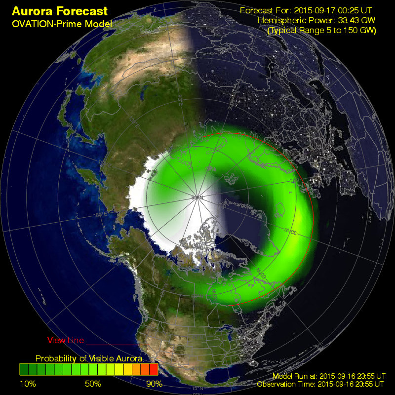 Prognoza owalu zorzowego z 17 marca 2015 roku, kiedy rozpoczynaliśmy naszą Fotomisję na Islandii. Rysunek nie przedstawia rzeczywistego owalu, a jedynie prawdopodobne obszary wystąpienia zorzy polarnej. Ciemnozielony kolor oznacza prawdopodobieństwo ok. 10% natomiast czerwony ponad 90%. Źródło: NOAA/Ovation