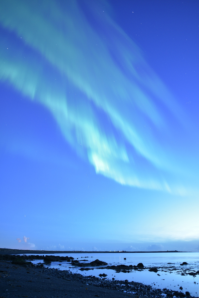Zorze świecą też za dnia, jednak wtedy jest zbyt jasno by je dostrzec. Na zdjęciu bardzo intensywna zorza, którą udało nam się sfotografować jednego wieczora podczas Fotomisji na Islandii, gdy na dworze nie było jeszcze ciemno.