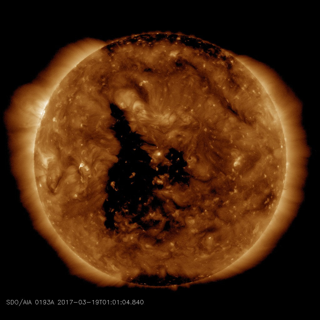 ![]() Zdjęcie korony słonecznej z widoczną sporych rozmiarów dziurą koronalną. Źródło: NASA/SDO |