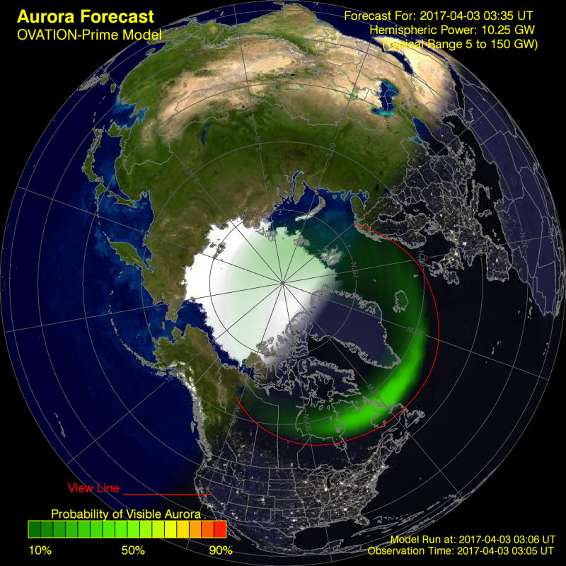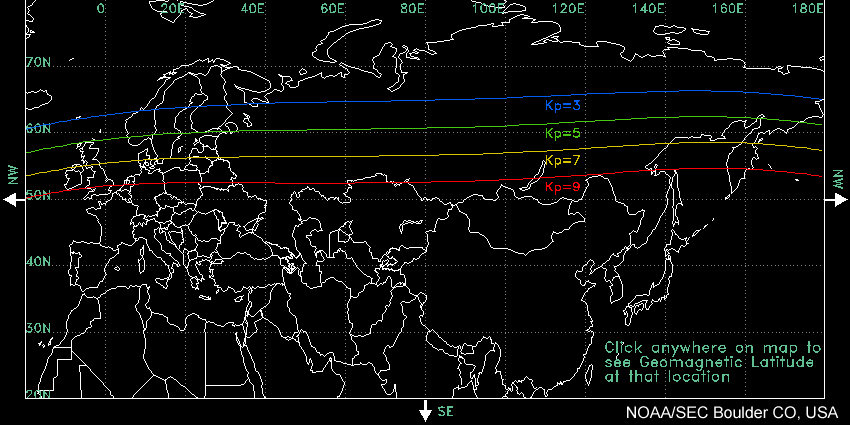 ![]() Granica owalu zorzowego w zależności od wartości Kp. Źródło: NOAA |