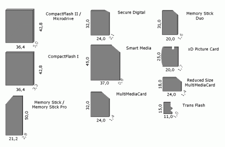 Dawniej w aparatach dane zapisywało się na zwykłe dyskietki 3.5 cala, teraz na rynku dostępnych jest dziesięć modeli kart pamięci. Wszystkie modele wraz z rozmiarami i zachowanymi proporcjami względem siebie, przedstawione są na rysunku poniżej.