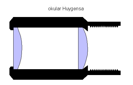 Okular Huygensa składa się z dwóch soczewek płasko-wypukłych skierowanych stronami płaskimi w stronę oka. Odległość między soczewkami równa jest połowie ich ogniskowych. Układ ten zapewnia niewielkie pole widzenia na poziomie 30-40 stopni (rozsądnej jakości jest jednak pole o rozmiarze około 25 stopni). Pozwala na wyraźne zmniejszenie aberracji chromatycznej w płaszczyźnie prostopadłej do osi optycznej i redukcję komy.