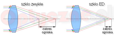 - Zbudować obiektyw zawierający soczewki zbudowane z bardzo egzotycznych i drogich szkieł o niskiej dyspersji (np. fluoryt, szkła ED - patrz poniższy rysunek). Taki obiektyw nazywamy często apochromatem.