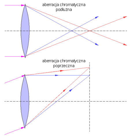 Wada optyczna przejawiająca się różnym miejscem ogniskowania się promieni o różnej długości fali. Jest wynikiem dyspersji szkła użytego do budowy soczewki, czyli różnym współczynnikiem załamania fal o różnych długościach (mówiąc prościej niebieskie światło, ze względu na większą energię, załamuje się w szkle mocniej niż światło czerwone). Rozróżniamy aberrację chromatyczną podłużną i poprzeczną. Na poniższym rysunku widać wyraźnie, że promienie niebieskie i czerwone załamują się w szkle soczewki inaczej i przez to ogniskują się w różnych miejscach.
