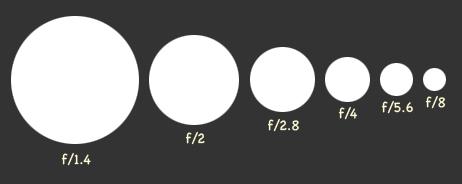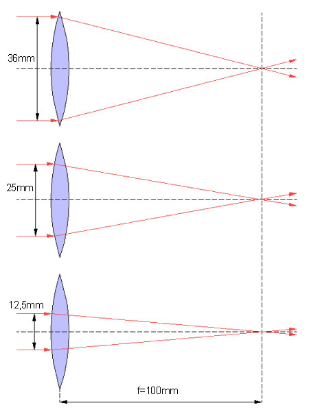 Poniższy rysunek pokazuje natomiast rzeczywisty rozmiar otworu zbierającego światło dla obiektywu o ogniskowej 100 mm oraz zastosowanych wartości przysłony, odpowiednio 2.8, 4 oraz 8. Warto zauważyć, że zgodnie z definicją, ogniskowa obiektywu (czyli w tym przypadku 100 mm) dzielona przez średnicę czynną daje odpowiednią wartość przysłony (światłosiłę).