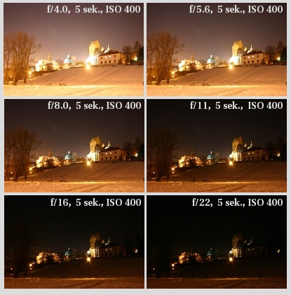 Poniższe zdjęcia pokazują ten sam obraz sfotografowany przy tej samej czułości matrycy, tym samym czasie ekspozycji i przy przysłonie zmieniającej się od f/4 do f/22. Ilość światła docierającego do matrycy zmienia się więc o czynnik 16.